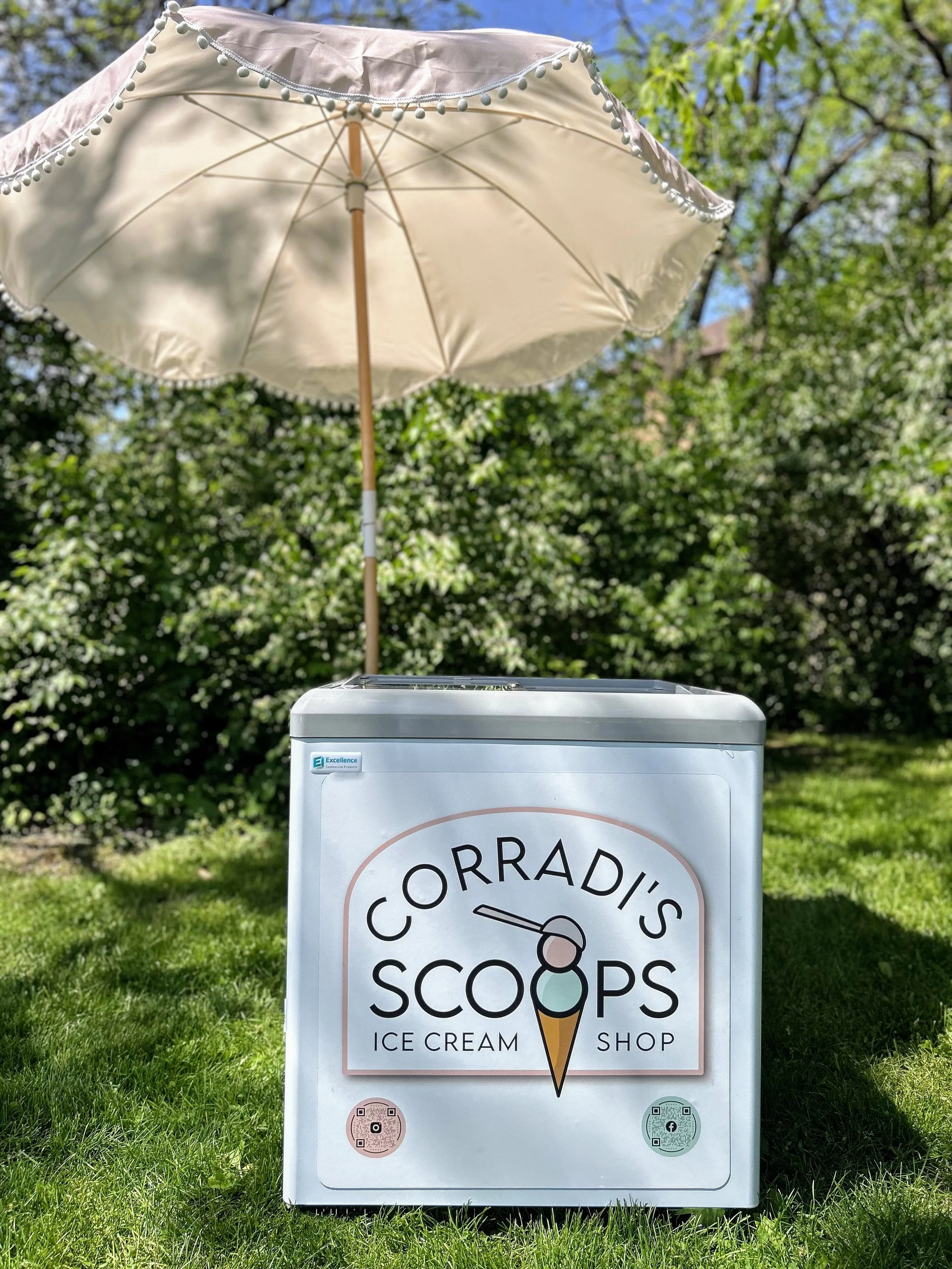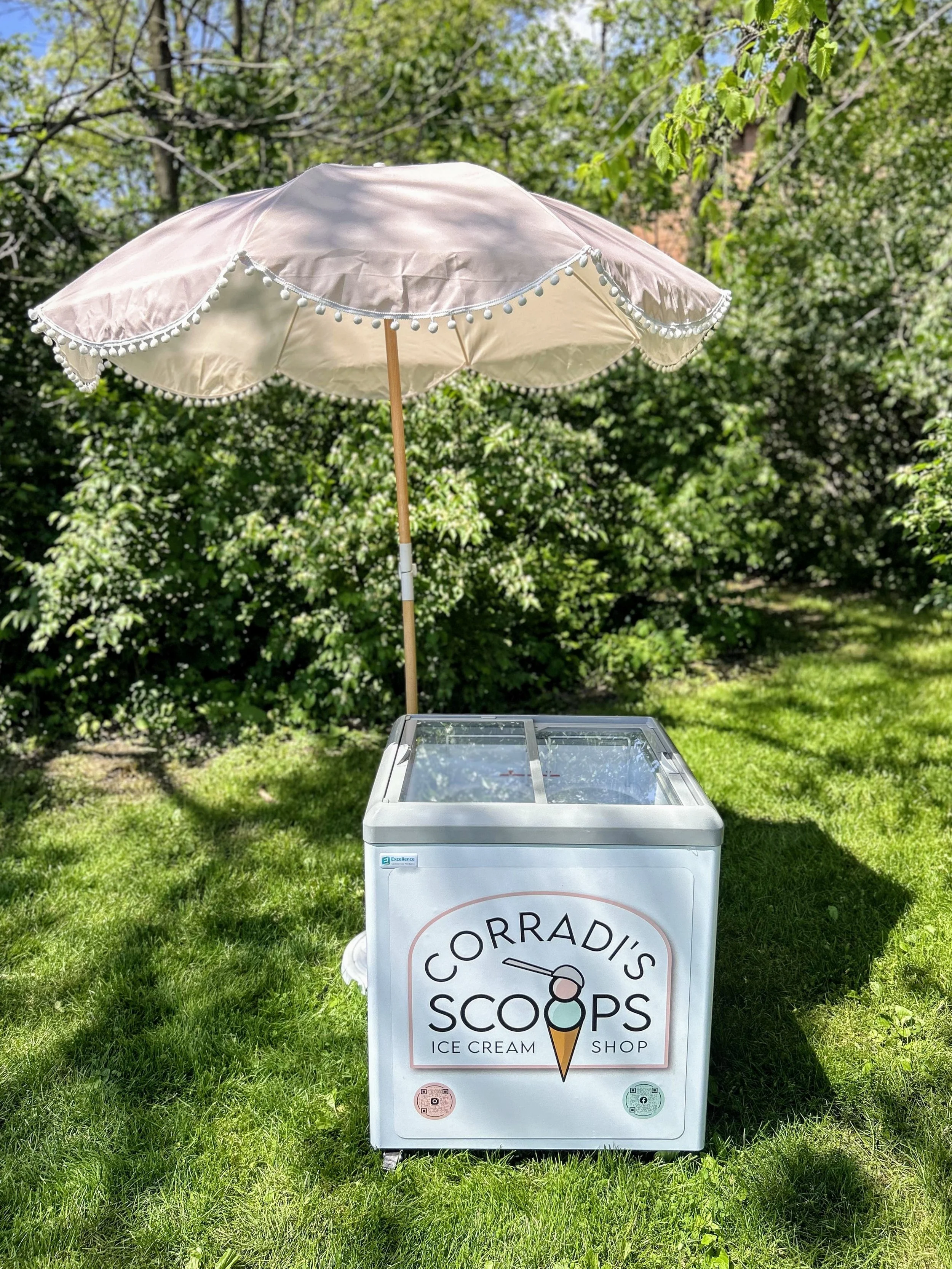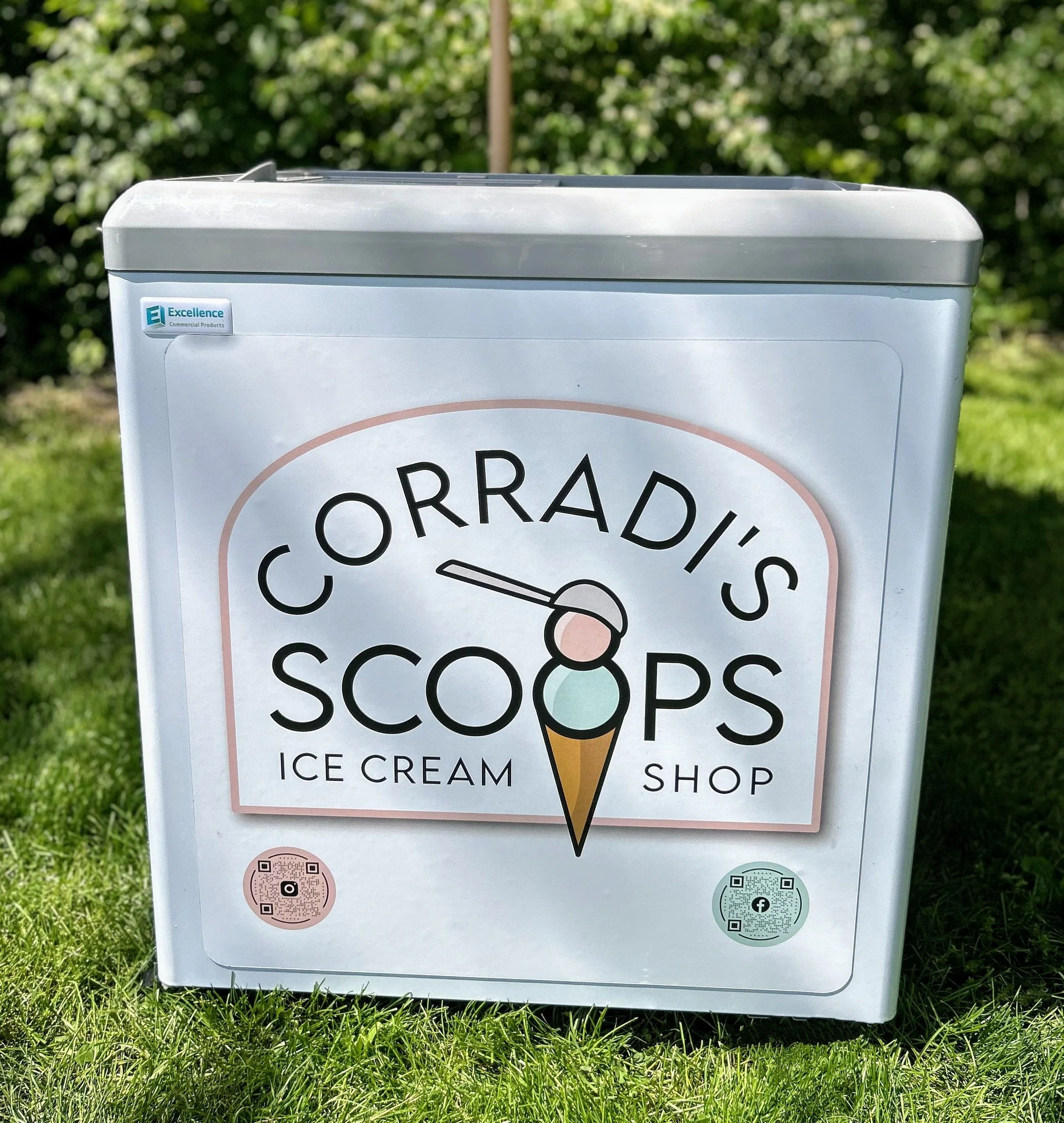 Toppings: hot fudge, caramel sauce, strawberry topping, whipped cream, & cherries.